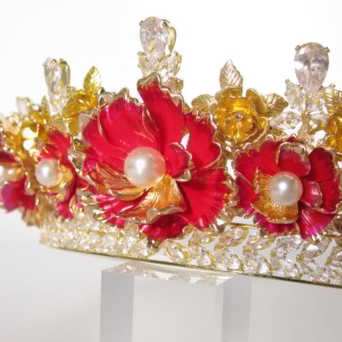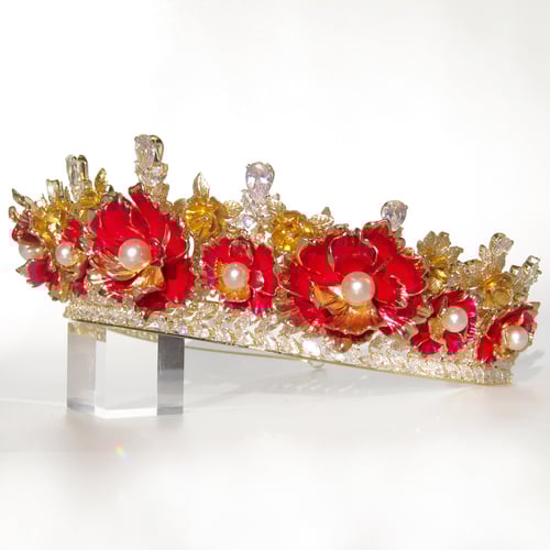 Searching for the perfect show-stoppper? Look no further! This handmade, one-of-a-kind crown oozes regal opulence - with a hint of whimsy. It is gold plated and encrusted with red enamel flowers, cubic zirconia crystals, pearlised beads and brass florets.
