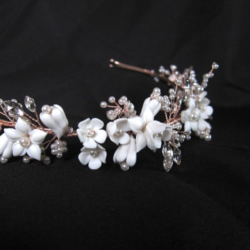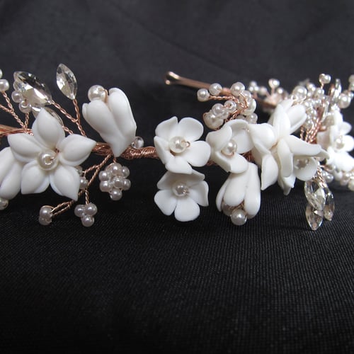 This handmade, rose gold-plated headdress features elegant ceramic flowers, intricate faux pearl beading and AAA-grade zirconia crystals.