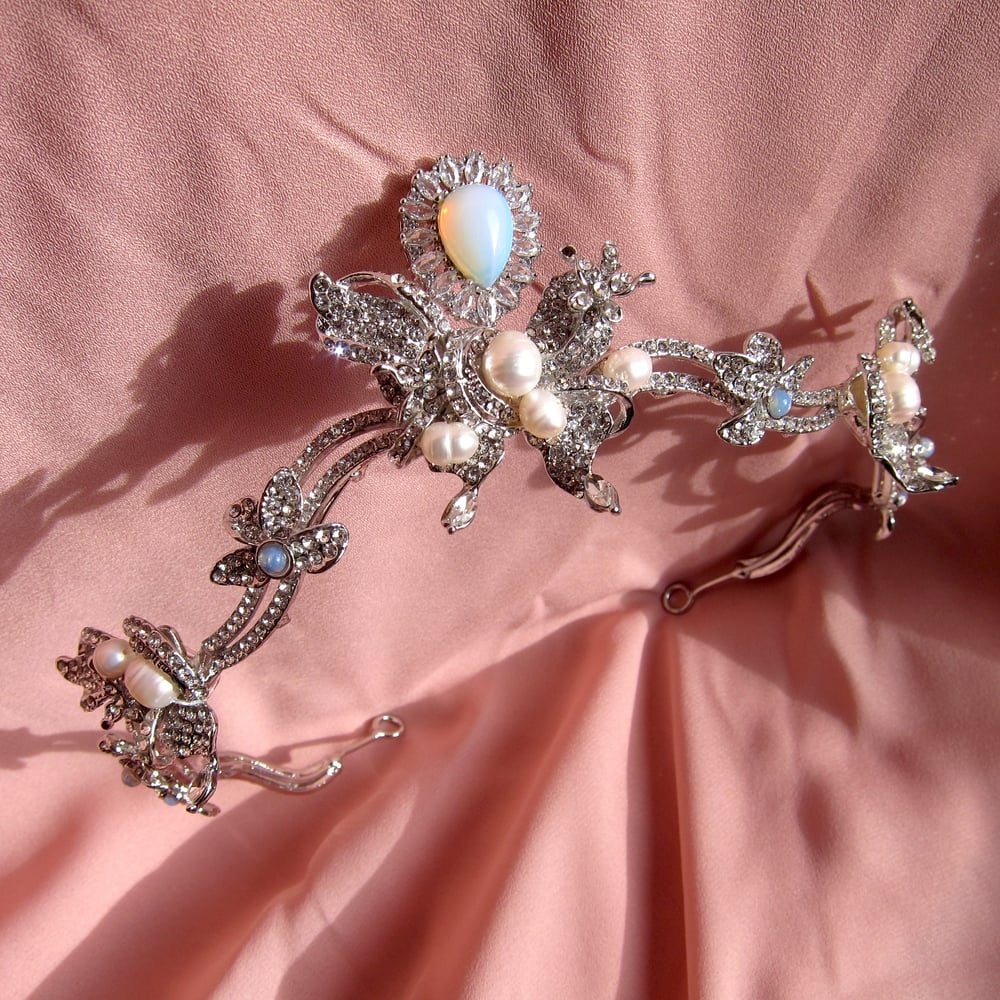 This handmade tiara features whimsical butterfly detailing and is encrusted with genuine moonstones, freshwater pearls and glittering cubic zirconias. It is platinum plated.
