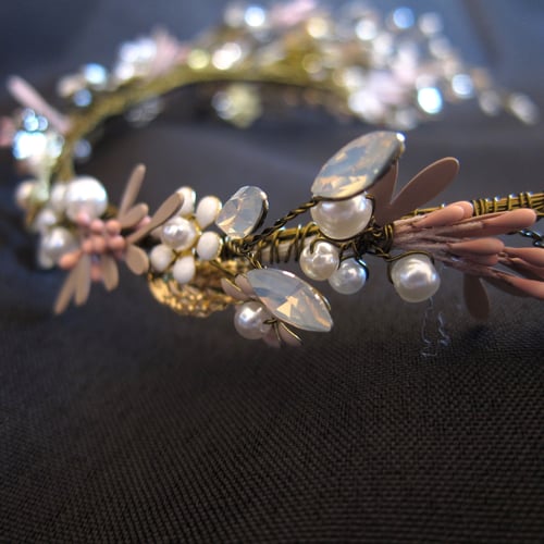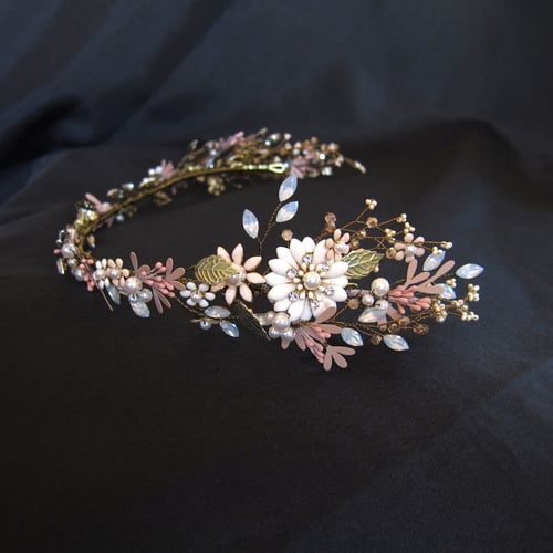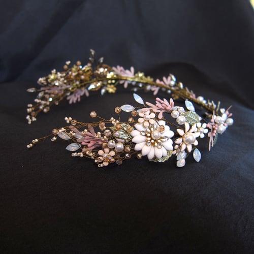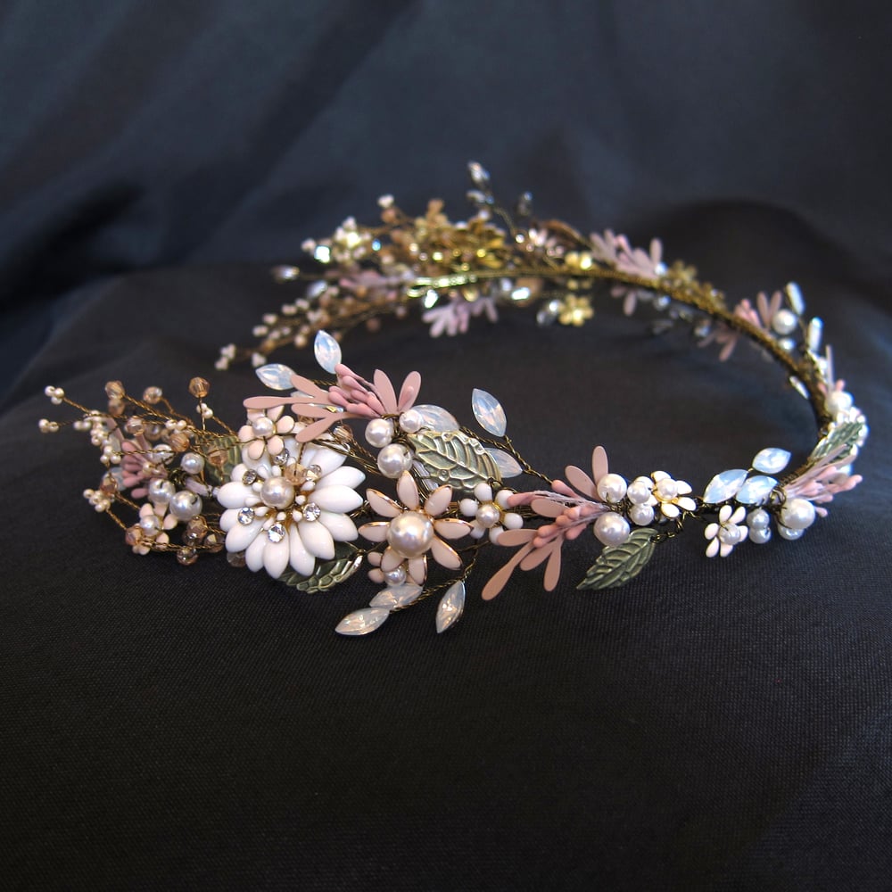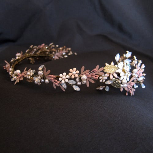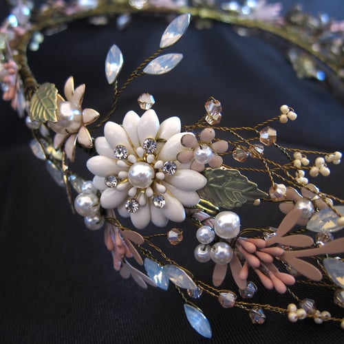 This handmade, gold-plated headdress is woven with mixed-media flowers, crystals and beading.